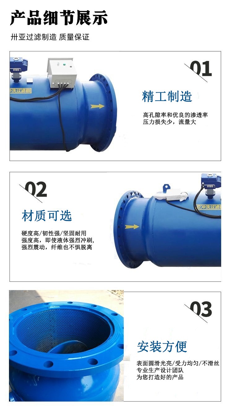 產品描述:反沖洗過濾器是一種智能電動驅動軸承運轉,用電動刷自動清除濾網雜質、自動排污、自動運行的新一代過濾器。它具有微電腦智能控制、電動刷除濾網雜質、自動排污、過濾與排污同時進行、安裝管理方便等特點。廣泛用于各類空調循環水給排水系統、污水處理,醫藥、...
